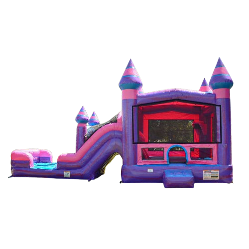 A bounce house area with basketball hoops and a double slide.