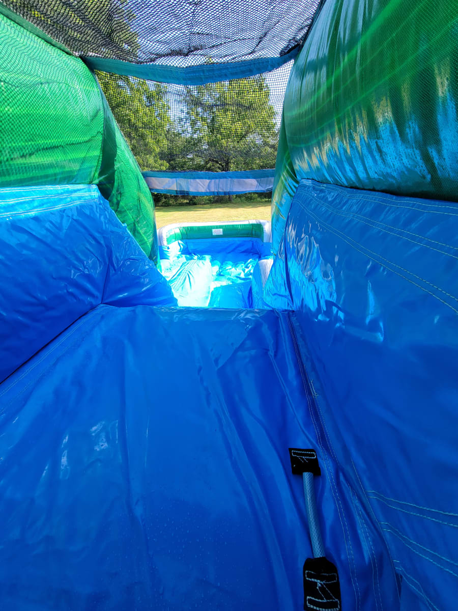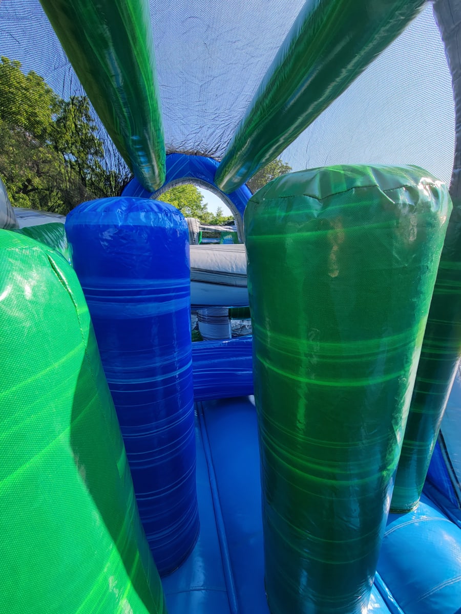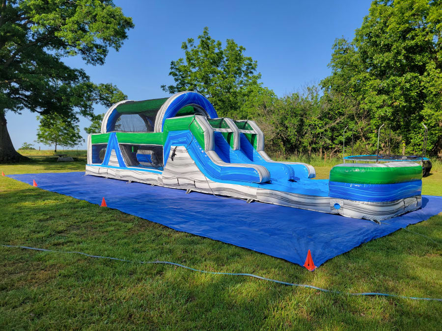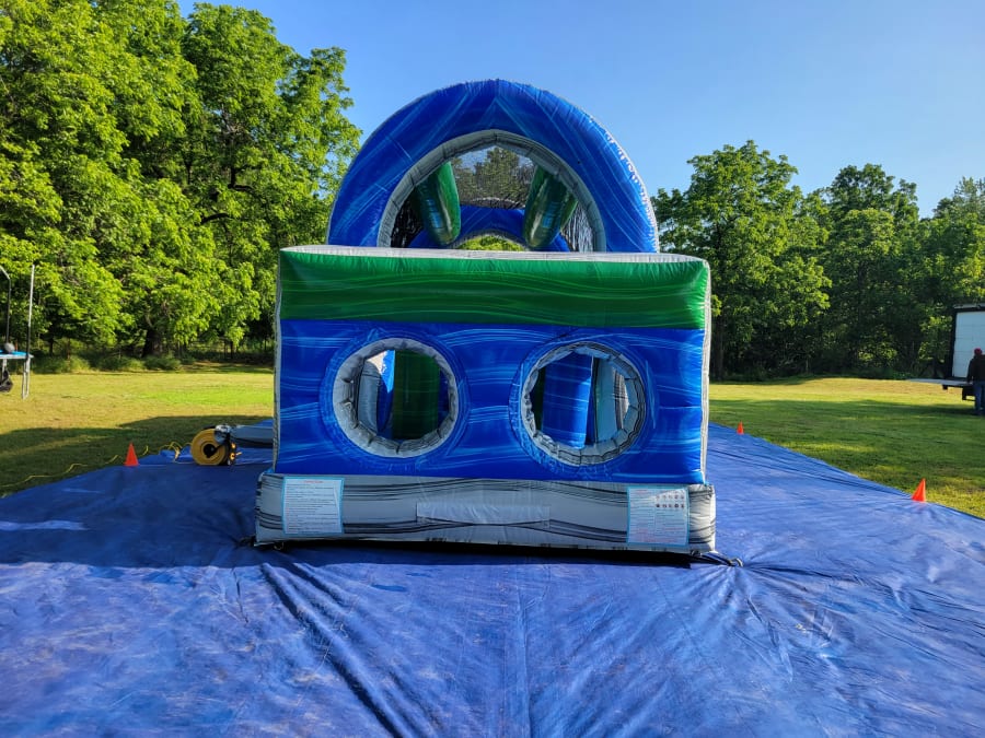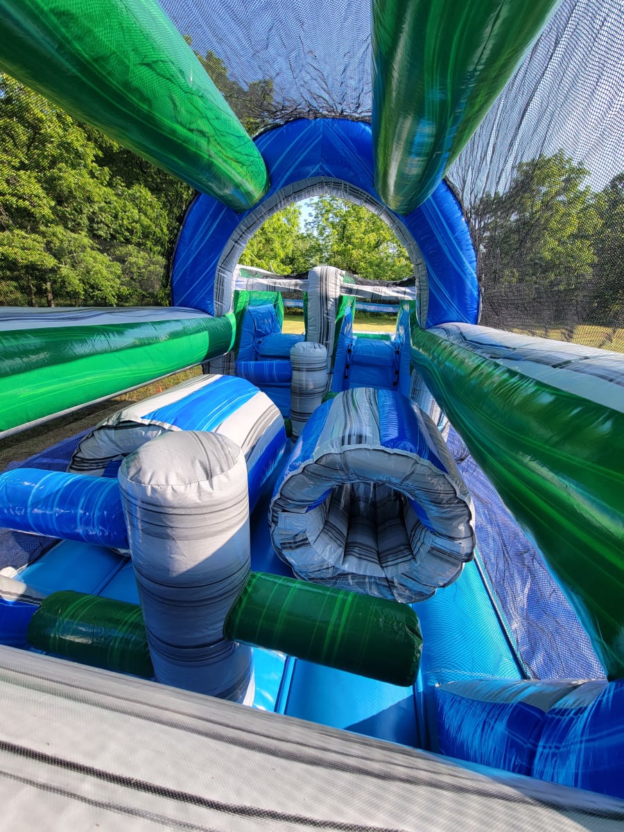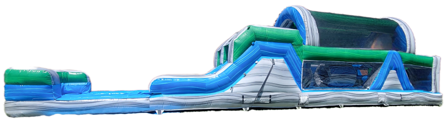 A 46 foot dual lane obstacle course with slides.
